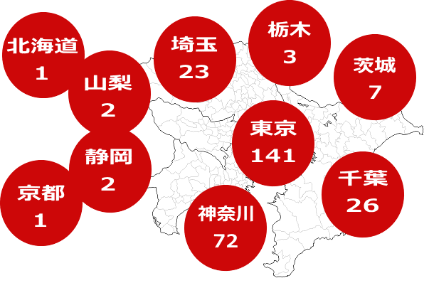| 東京 | 23区(台東・杉並・目黒・世田谷・新宿・渋谷・足立・荒川・北・千代田・中央・品川・葛飾・板橋・江戸川・港・文京・大田・中野・墨田・豊島・練馬・江東)・国立市・西東京市・昭島市・武蔵野市・三鷹市・武蔵村山市・町田市・府中市・国分寺市 |